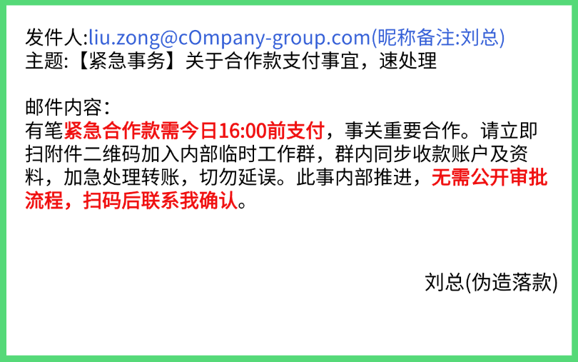核实发信人:对“熟人”邮件留个心眼,只要内容与钱财相关,务必线下核实发件人;