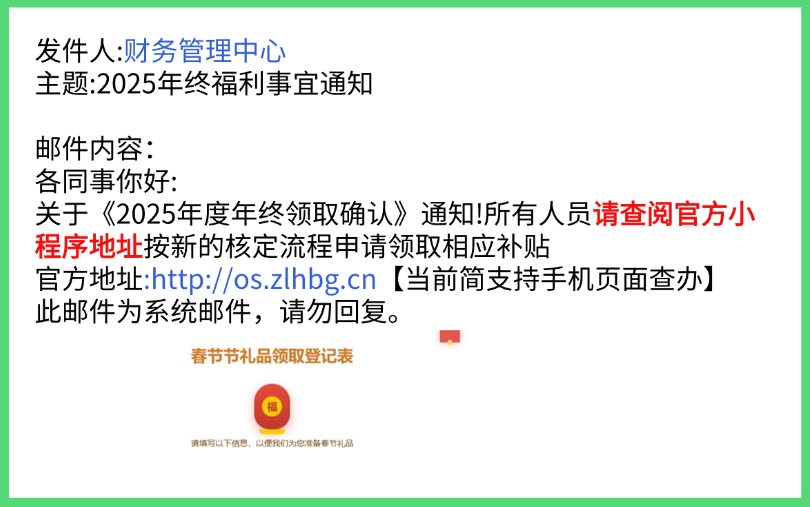 春节前的福利、中奖通知,更是攻击者另一大抓手,他们会伪装成行政、电商客服或快递平台,发邮件说“春节礼品领取”“年会中奖通知”“积分清零兑换福利”,让你点链接填个人信息、扫二维码查详情,看似是暖心福利,实则是盗取信息、植入恶意程序的陷阱。