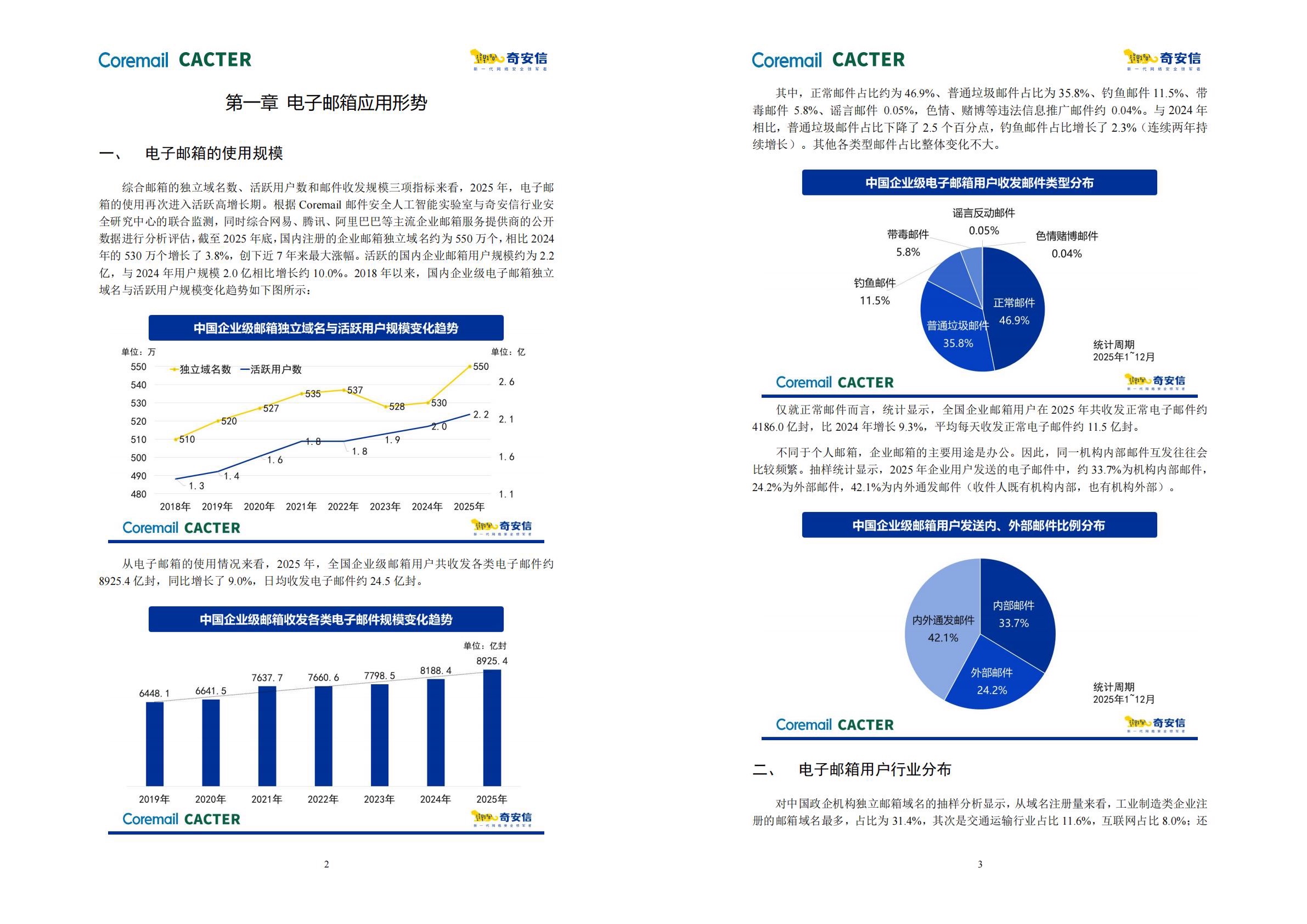 Coremail邮件安全人工智能实验室、CACTER邮件安全研究团队及奇安信行业安全研究中心联合发布《2025年中国企业邮箱安全性研究报告》(简称“报告”),基于全年全域监测数据,报告深度拆解2025年企业邮箱安全态势,精准揭示各类恶意邮件及暴力破解的攻击逻辑,为企业搭建高效防护体系提供可落地的实操指引。