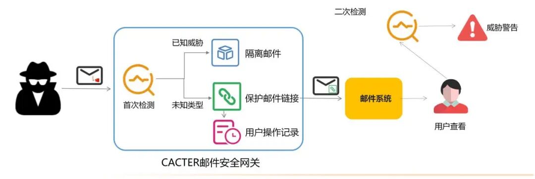 首次过滤+二次检测防护,事前拦截、事中提醒、事后追溯结合,为邮件系统的邮件安全保驾护航。