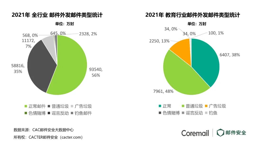 根据CAC邮件安全大数据中心的数据显示,2021年教育行业邮箱用户外发邮件中,只有38%是正常邮件,其中48%为垃圾邮件。Coremail邮件安全解决方案专家刘骞对此表示,通常一旦出现盗号,就会大量外发垃圾邮件,外发垃圾邮件占比高这也说明了2021年教育行业盗号数量较多。