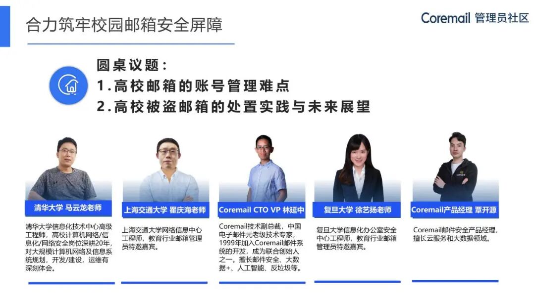 出席嘉宾包括清华大学信息化技术中心高级工程师马云龙、上海交通大学网络信息中心工程师瞿庆海、复旦大学信息化办公室安全中心工程师徐艺扬、Coremail CTO VP林延中Tim、Coremail邮件安全产品经理覃开源、Coremail邮件安全解决方案专家刘骞。