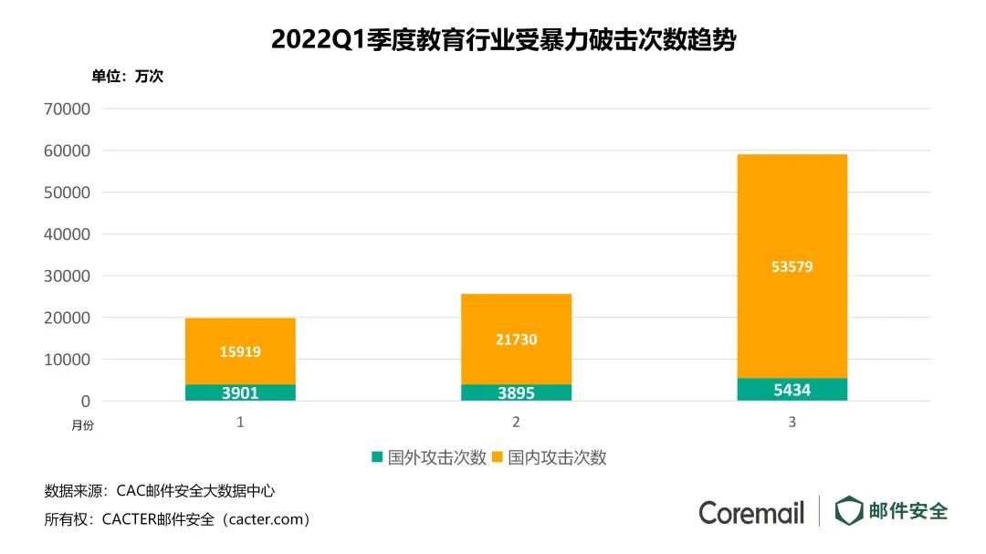 进一步查看防暴卫士监测的盗号相关数据,发现针对教育行业的暴力破解更是泛滥,3月份呈现爆发式增长高达5亿多次,且大部分攻击IP在国内,攻击次数以亿进行计数。