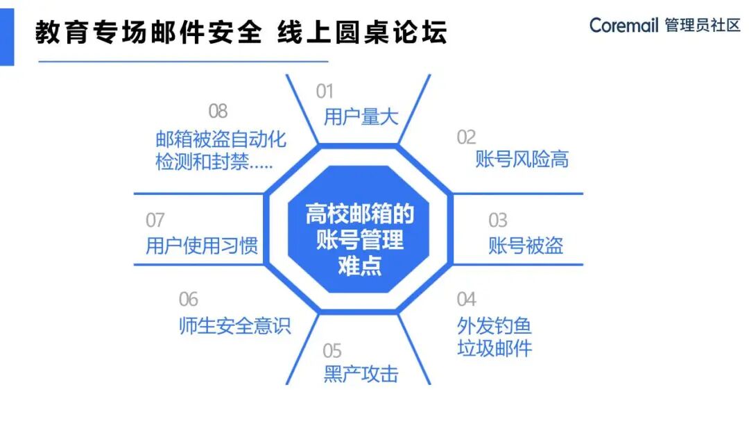 严峻态势下,此次圆桌议题聚焦于教育行业的盗号问题。Coremail与各位高校大咖共同探讨了如何处置高校被盗邮箱账号的具体实践与未来展望。