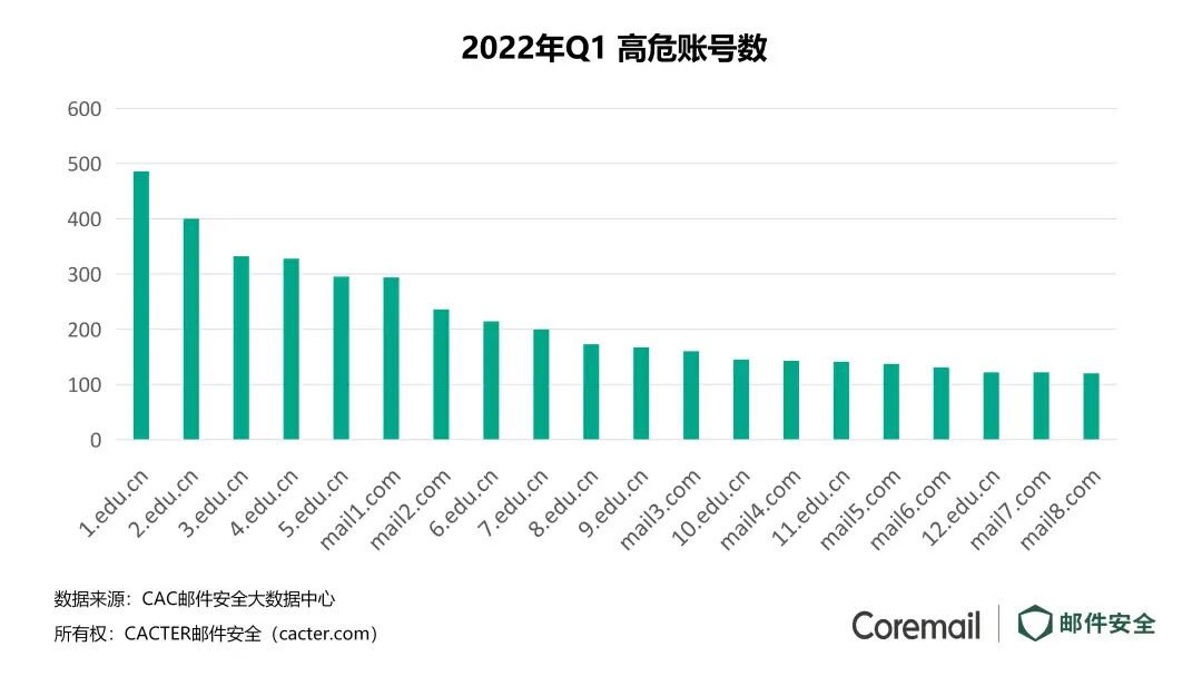 从受攻击域名而言,2022年Q1高危账号总数量的TOP20(全行业)中,有12个为高校,占比60%。