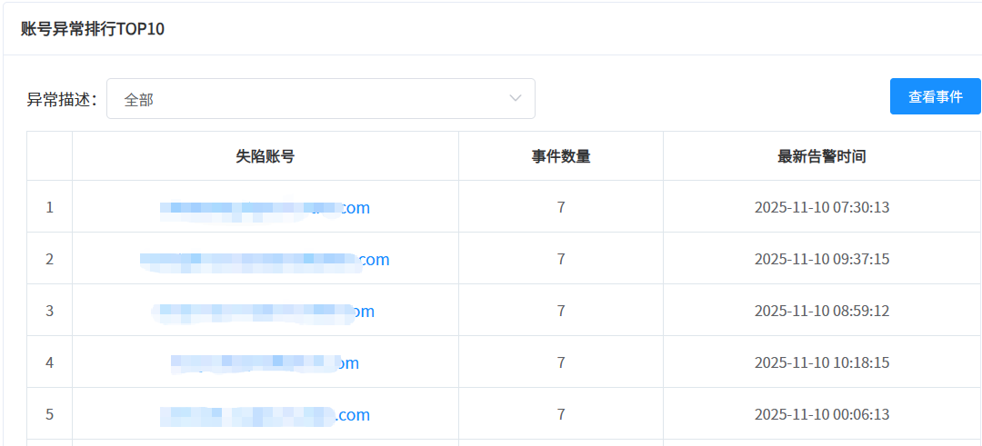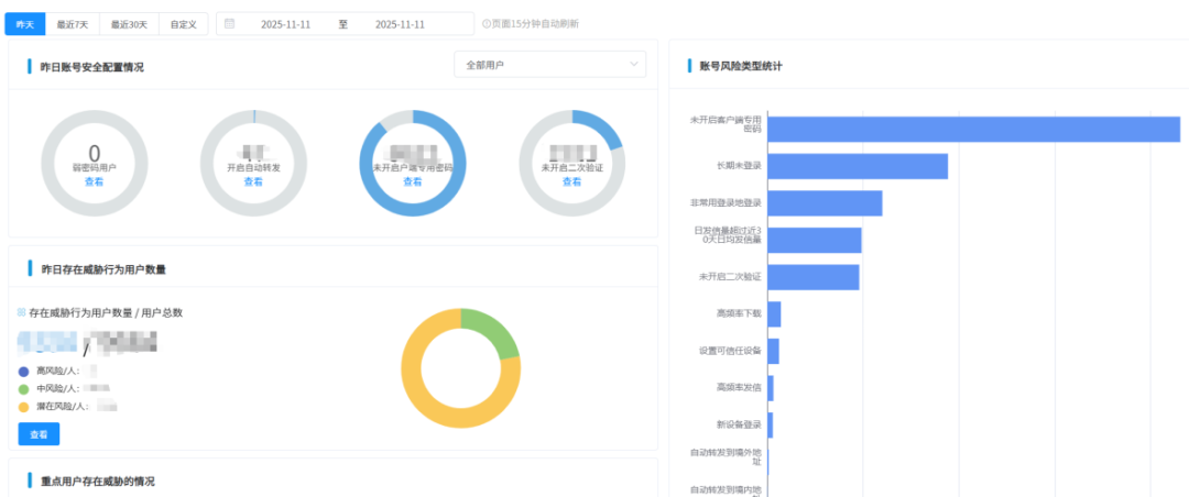 异常排查高效化:快速调取员工账号安全配置、登录数据、风险类型统计,30分钟内完成以往数小时的排查工作,无需逐一找跨区生产、销售同事沟通,保障跨区域邮件协同不中断。