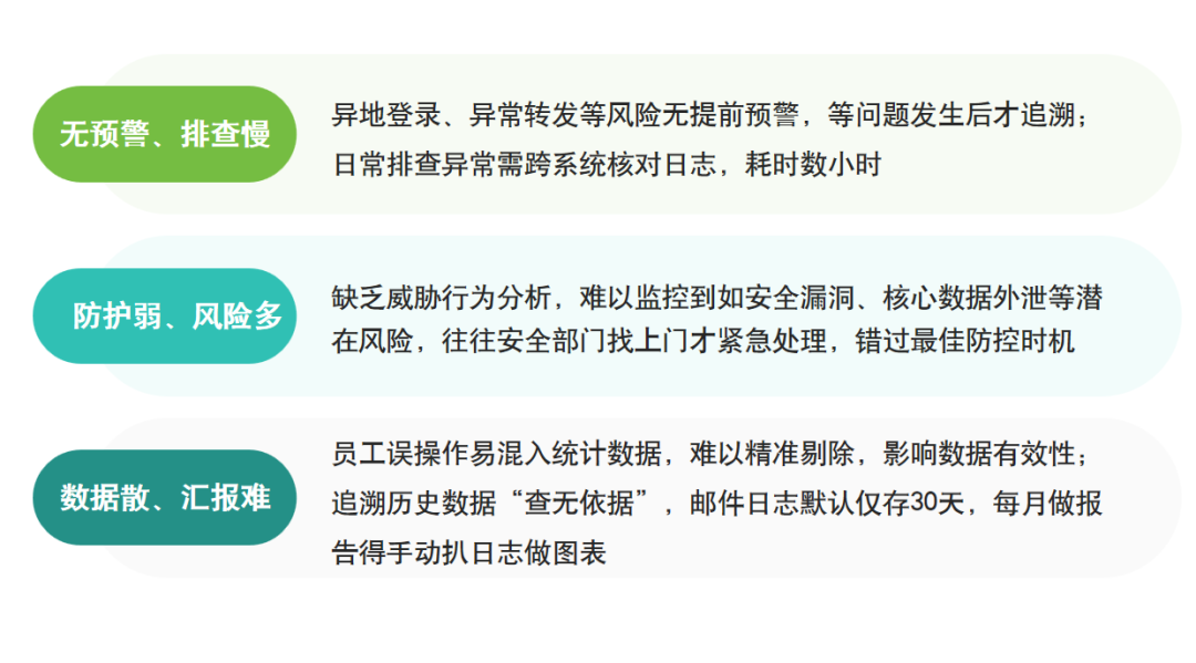 2万多人的庞大团队,分散在不同区域,邮件账号异常、数据泄露风险藏在海量信息里,以前排查问题全靠手动翻日志,一旦出现安全问题难以及时响应,不仅会打乱业务协作效率,更可能导致核心业务数据外泄,处于‘被动救火’的状态。