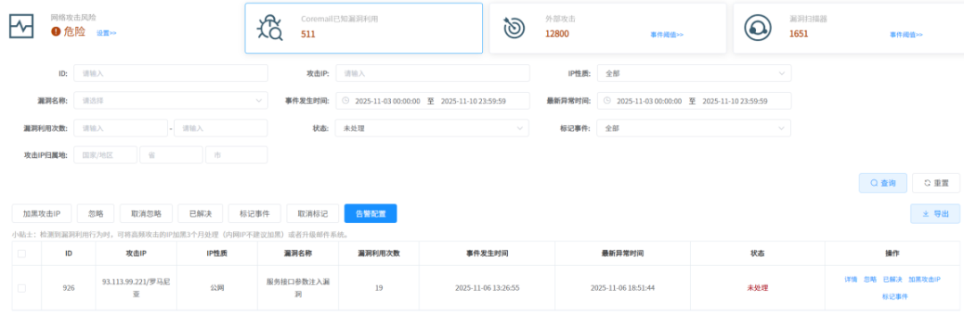 态势实时掌控:每日可查看攻击态势界面,直观了解针对邮箱中生产数据、订单信息的攻击量级与类型,风险动态提前掌握;